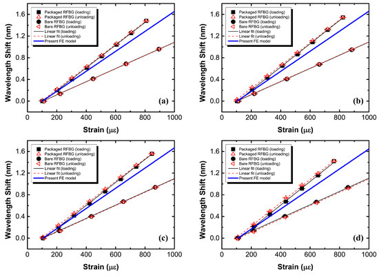 The axial strains of the optical fiber were obtained from the 3-D FE simulation by obtaining an average strain for the nodes along the symmetry axis of the fiber and over 8-mm gauge length equivalent to the grating length of RFBG. Accordingly, the numerical results of the shifts in Bragg wavelength were calculated by substituting the axial and radial strains of the optical fiber into Equation (3).