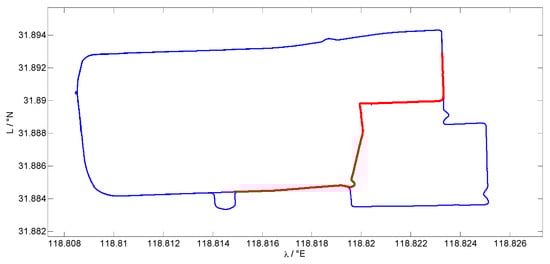 Additionally, to reduce the computational complexity, the inputs of the AI module are simplified. As illustrated in Section 4, only yaw information among the three attitudes is employed. Meanwhile, because the land vehicle was operated on a smooth trajectory without hilly roads, only the horizontal velocities and specific forces are considered. The similar simulation is also done to make a comparison of the simplified solution and the full inputs solution. The mean values of the prediction errors of simplified solution and full inputs solution in latitude are and , while the standard deviations are and . The mean values of the prediction errors in longitude are and , while the standard deviations are and , respectively. Thus, the simplified solution is adopted in this study as it can achieve almost the same prediction accuracy as the full input solution.