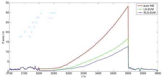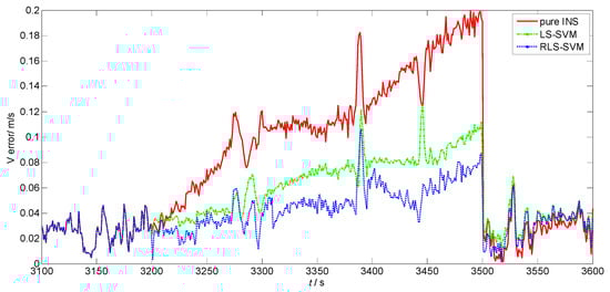 Both the LS-SVM algorithm and the pure INS are compared with the RLS-SVM method to evaluate its performance. As the altitude damping method is employed by the system, only horizontal errors are involved to make a judgment. Figure 3 and Figure 4 present velocity errors and position errors among different algorithms from 3100 s to 3600 s, respectively. Before 3200 s, the GPS signal is still available and the whole system is in the loosely-coupled mode, where the three methods show the same navigation result. From 3200 s to 3500 s, the GPS is unavailable. The performance of the three methods varies. The red lines in both figures indicate the navigation results of the pure INS mode, while the green dashed lines and blue dotted lines denote the performance of the LS-SVM and RLS-SVM algorithms, respectively. It can be seen that the proposed RLS-SVM method outperforms the LS-SVM method, which is much better than the pure INS mode. The velocity and position accuracy of all the three navigation solutions deteriorates with time during the GPS outage. At 3500 s, the horizontal velocity errors of the pure INS, LS-SVM and RLS-SVM are 0.198 m/s, 0.1115 m/s, and 0.0869 m/s, while the position errors are 33.26 m, 16.72 m, and 12.72 m, respectively. We can see that during the GPS outage, the proposed algorithm achieves good performance when the vehicle operates in this irregular trajectory. The LS-SVM algorithm, which suffers from the GPS outliers, cannot reach the best model to predict the position increments. At the end of the GPS outage, the velocity and position errors of the RLS-SVM algorithm are only about 40% of the pure INS method and 75% of the LS-SVM method.