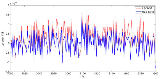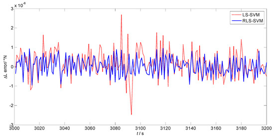 During the training period, where the first 2300 s data is trained and investigated, the 2300 s data is separated into two data sets. The training set includes the data from 900 s to 3000 s, which is used to train the LS-SVM and RLS-SVM models. The validation set involves the data from 3001s to 3200 s, which is utilized to validate the effectiveness of the trained models. Thus, the effectiveness of the prediction of the position increments of the two models can be compared on the validation set, which is shown below.
