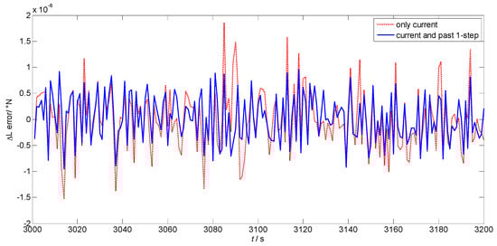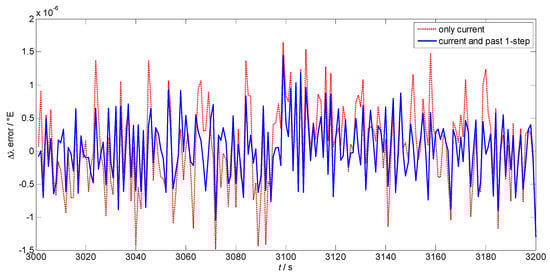 In previous studies, the historical data was also employed to better describe the dynamic situation and make a more accurate prediction [18,19,20]. However, the steps of the past data should be carefully selected, which varies in different models and applications. In this study, the number of the steps of the past data are considered from 0 to 2, where 0 means only the current data is employed. Figure 7 and Figure 8 shows the prediction errors of the position increments in latitude and longitude using different steps of the past data. The red dotted lines are the results when only the current data is used to train the RLS-SVM module. The blue lines are the results when both the current and the past one-step information is utilized. In addition, the similar analysis is conducted involving two steps of the past data. The mean values and the standard deviations of the prediction errors using different steps are listed in Table 1.