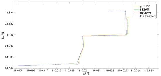 Figure 9 shows the positioning results of the pure INS method, LS-SVM method, and the proposed algorithm. The true trajectory is also plotted to make a comparison. It can be seen that the proposed algorithm could provide a relatively higher accuracy solution to bridge the GPS outage.