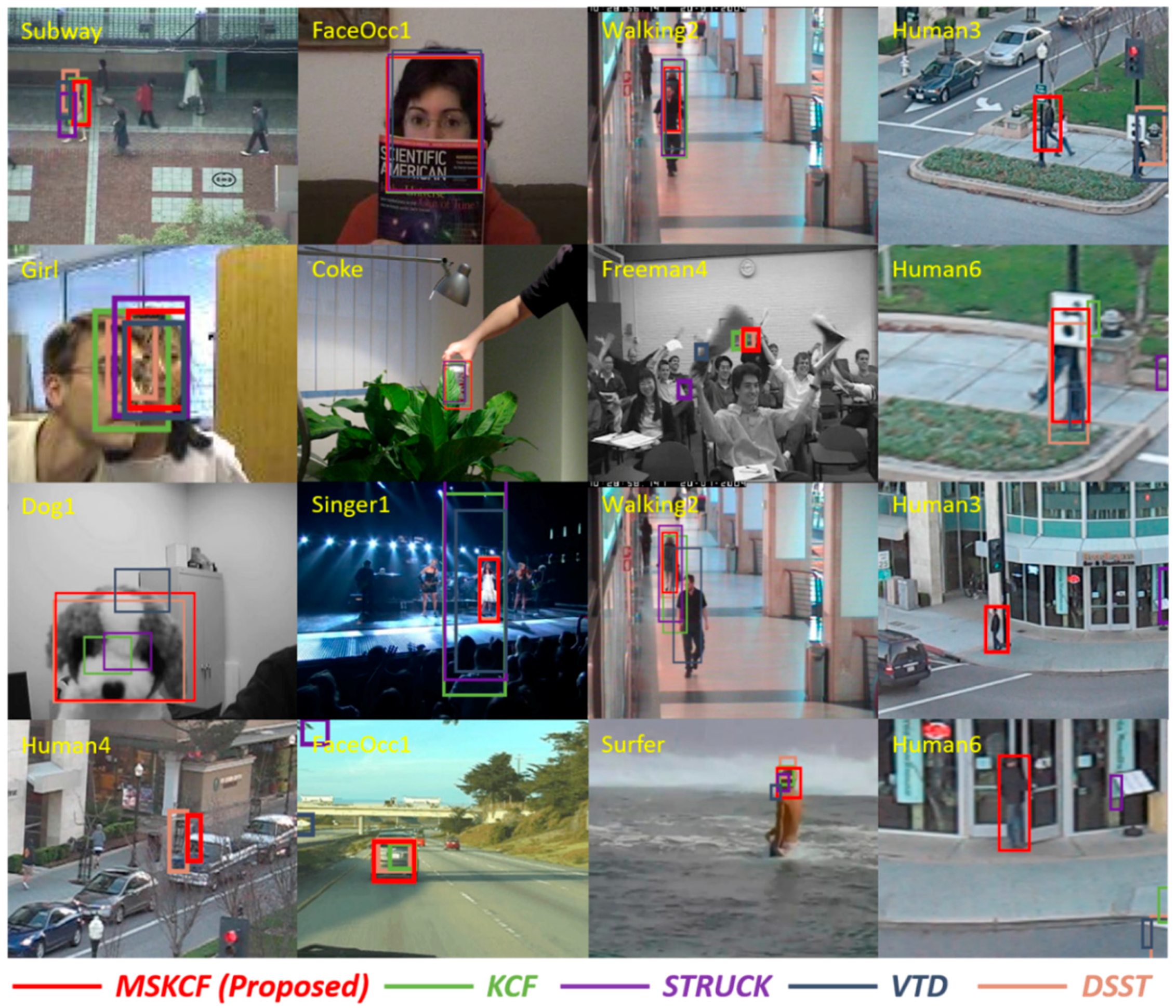 The correlation filter-based tracker is currently the most actively researched tracking algorithm [15,16,17,18,19,20,21,22,23]. According to the convolution theory, correlation is computationally highly efficient because it can be calculated as a simple product of two signals in the frequency domain. Consequently, trackers based on correlation filters have low computation. The minimum output sum of squared error (MOSSE) [17] by Bolme et al. successfully used correlation filters on tracking and showed impressive performance and speed. Henriques et al. presented a more effective method using the correlation filter proposed by the circulant structure with kernels (CSK) tracker [18]. The MOSSE tracker uses the intensity feature of the image and processes several hundred frames per second (FPS) because of the linear correlation filter applied. The CSK tracker uses the same intensity feature as the Gaussian kernel; therefore, the speed is slightly lower than that of MOSSE, but the accuracy is higher. The color name (CN) tracker [19], which is based on the CSK tracker, uses a feature that can express color properties well based on the Color Name [33]. As the dimension increases, the CN tracker proposes an updated model suitable for dimension reduction and high dimension feature through PCA. The scale adaptive with multiple features tracker [20] combines the histogram of gradient (HOG) feature with CN and also considers the change in size of the object by creating a pyramid scale pool. The discriminative scale space tracker (DSST) constructs a correlation filter with a three-dimensional correlation filter and proposes an effective tracking algorithm using a translation filter and a joint scale space filter. The KCF [16], an extended version of the CSK tracker, is the most widely used tracker that is currently employed because it offers high accuracy and speed. Therefore, this study, which is based on the KCF tracker, estimates the scale using the scale space and uses the highly effective multi-block scheme to ensure the tracker is robust to partial occlusion.