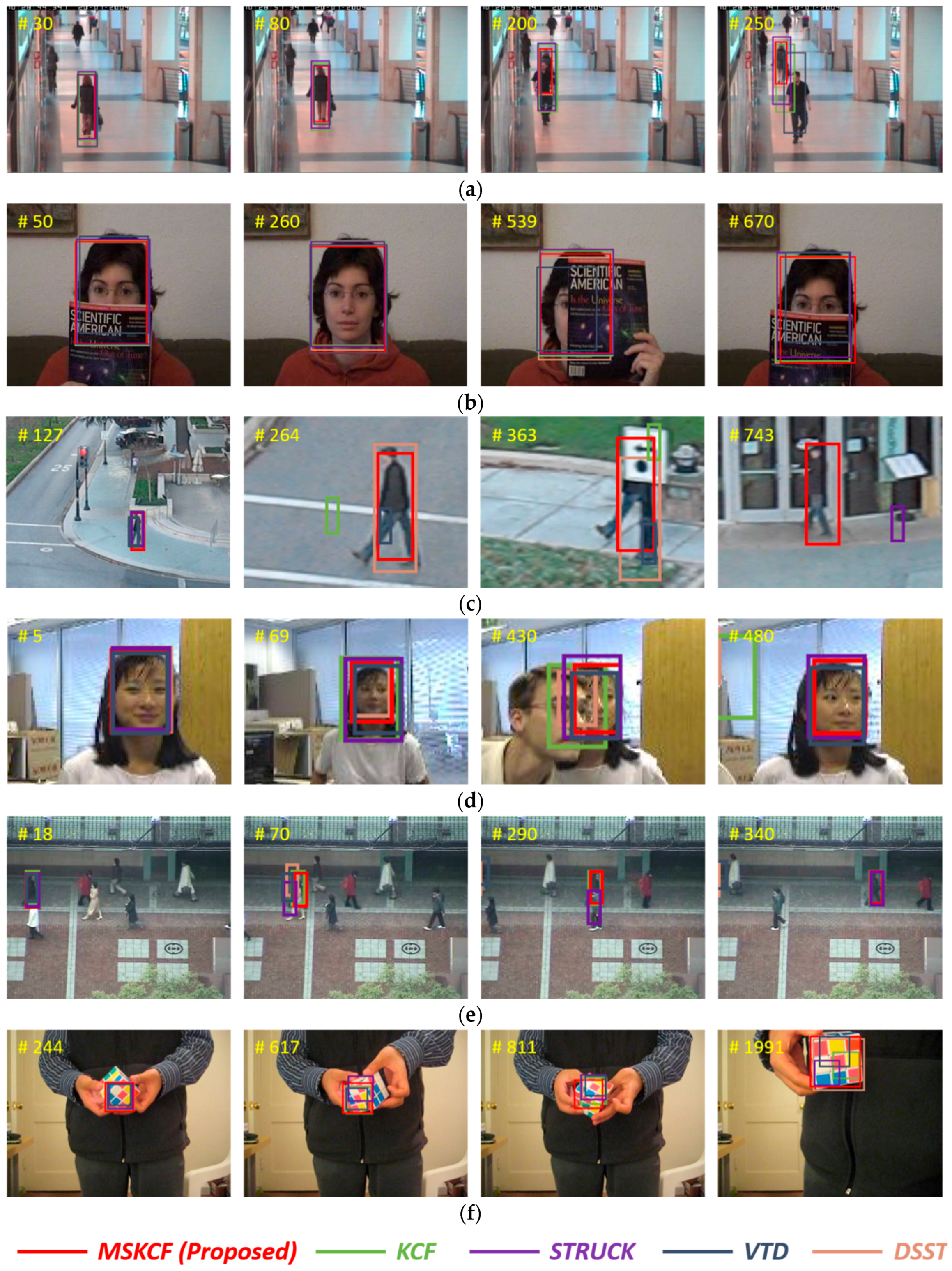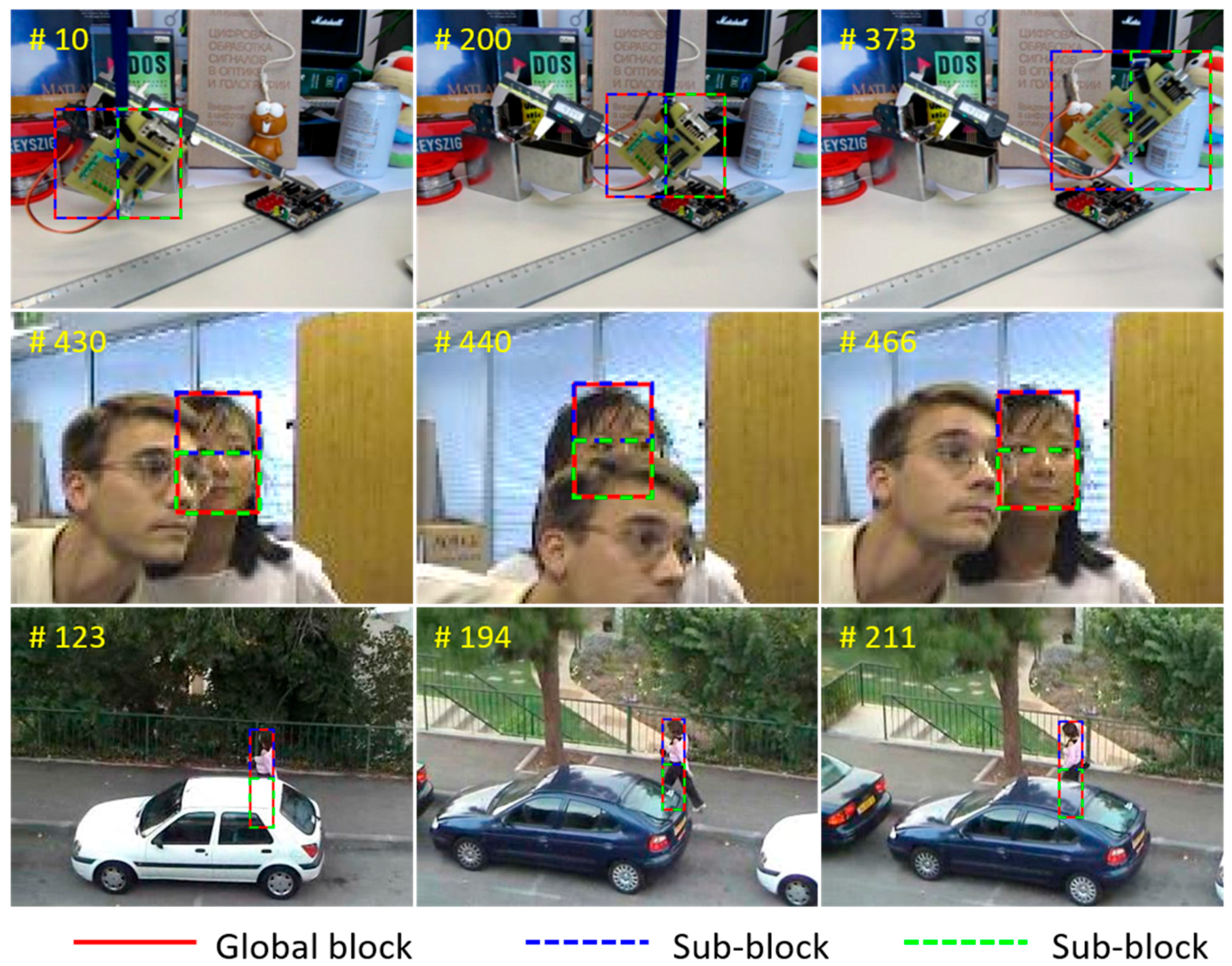Various approaches have been used to overcome the problem of occlusion [24,25,26,27,28,29]. The part-based model is particularly robust to occlusion. For example, crowded scenes are characterized by occlusions of individual persons and Shu et al. [24] employed the part-based model with person-specific SVM classifiers to address the partial occlusion of persons. Zhang et al. presented a part-matching tracker [25] that is based on a locality-constrained low-rank sparse learning method among multiple frames. The online weighted MIL (WMIL) tracker is an enhancement of the MIL tracker [26]. WMIL determines the most important sample in the current frame and presents more efficient learning procedures. Others proposed a part-based model based on the correlation filter [24,25,26]. Osman et al. [27] used four parts based on the CSK tracker. Liu et al. [28] proposed a model based on the KCF tracker and particle filter and used Bayesian inference to merge the response map of difference parts. The method proposed by Yao et al. [29] is based on KCF tracker. It combines a response map using a graph and a minimum spanning tree.