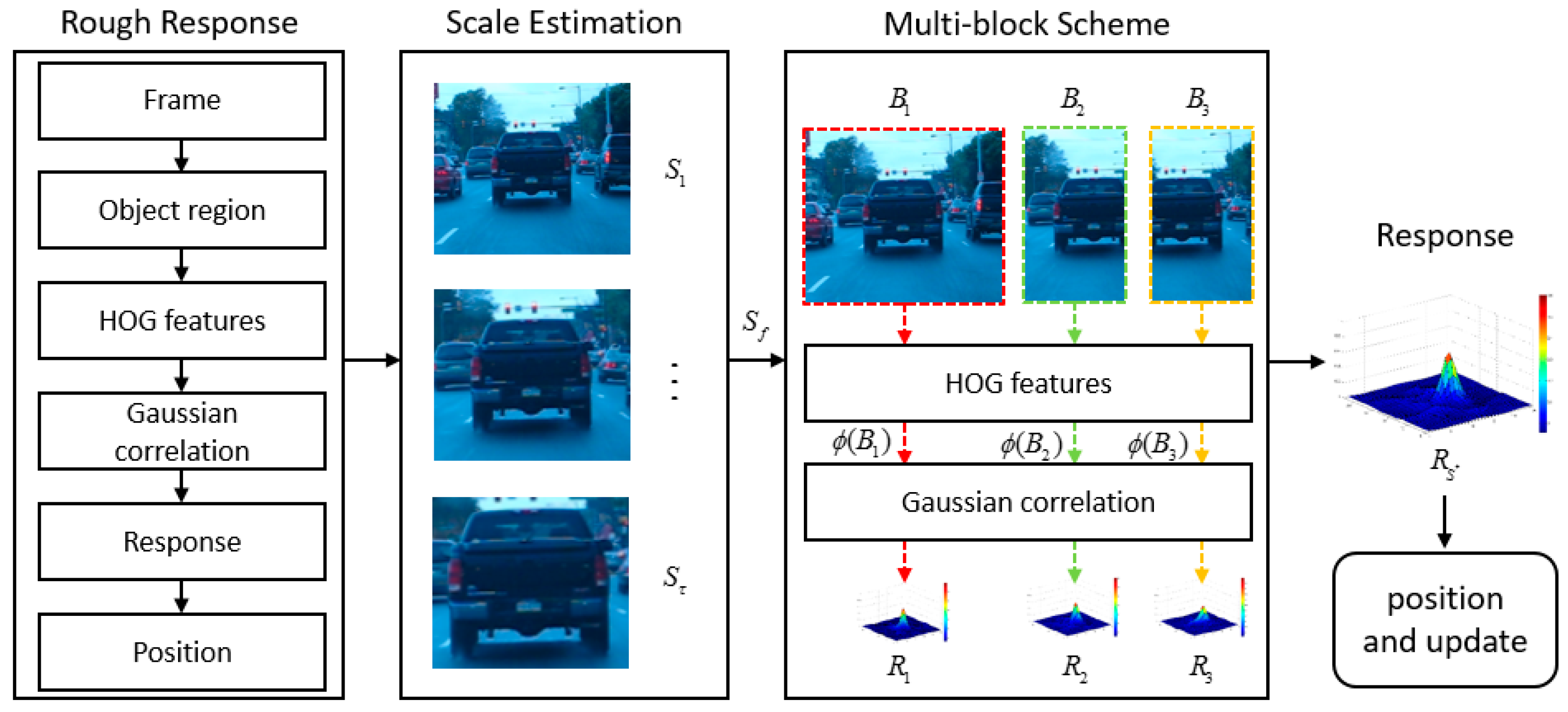 In this section, we propose our robust model to address occlusion and scale variation based on the KCF tracker [16], which has both impressive performance and speed. We briefly describe the KCF tracker and scale space filter of the pyramid searching method. Then, based on the size of the estimated scale, we explain our multi-block scheme for the part-based model. Finally, we explain the state-update scheme aims to improve the robustness of the results of each process.