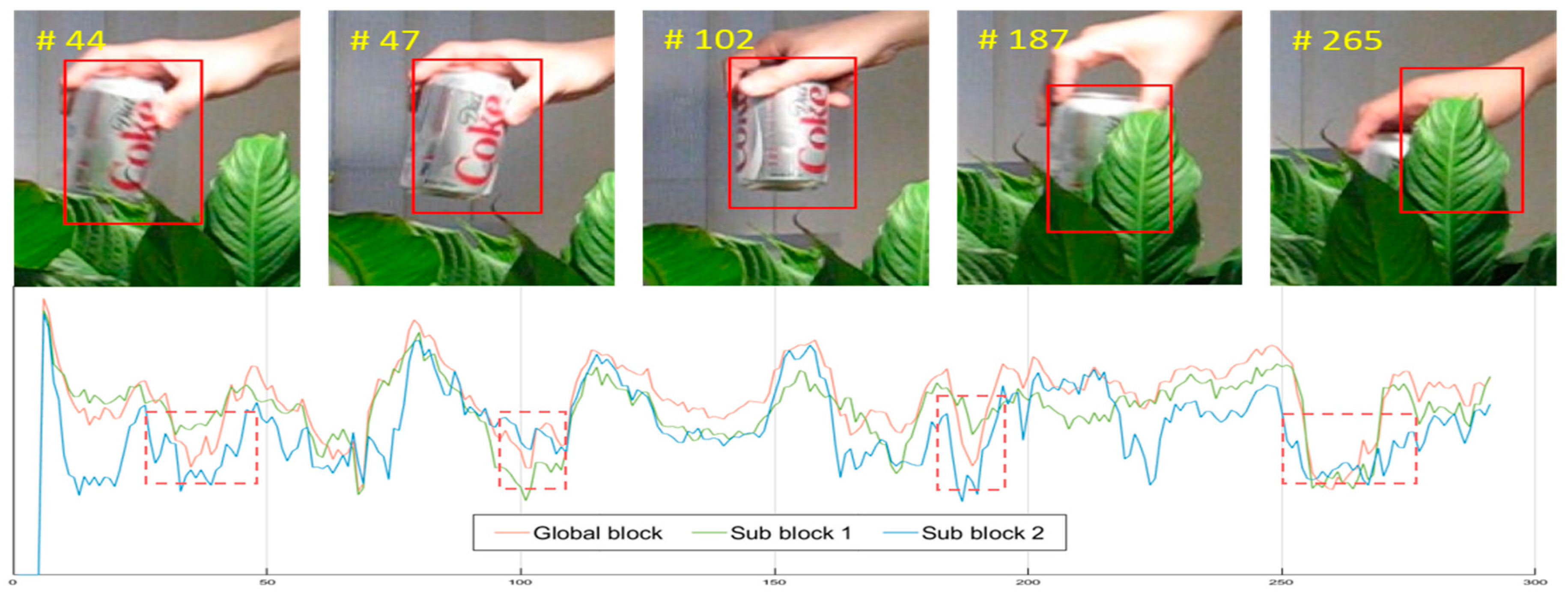 In this work, three response maps are generated from multi-blocks, and we need to select the proper block using Equation (8). If the response map has a lower peak value, the region may experience change of state such as occlusion and deformation. For robust tracking in the case of partial occlusion, we select the maximum response value among the three response maps as a new tracking point. Then, is the newly selected block. If the selected block is one of sub-blocks, the next tracking region is shifted in correspondence to the previous center coordinates such that the original target object is covered.