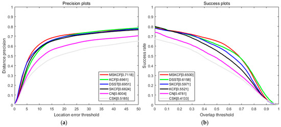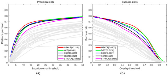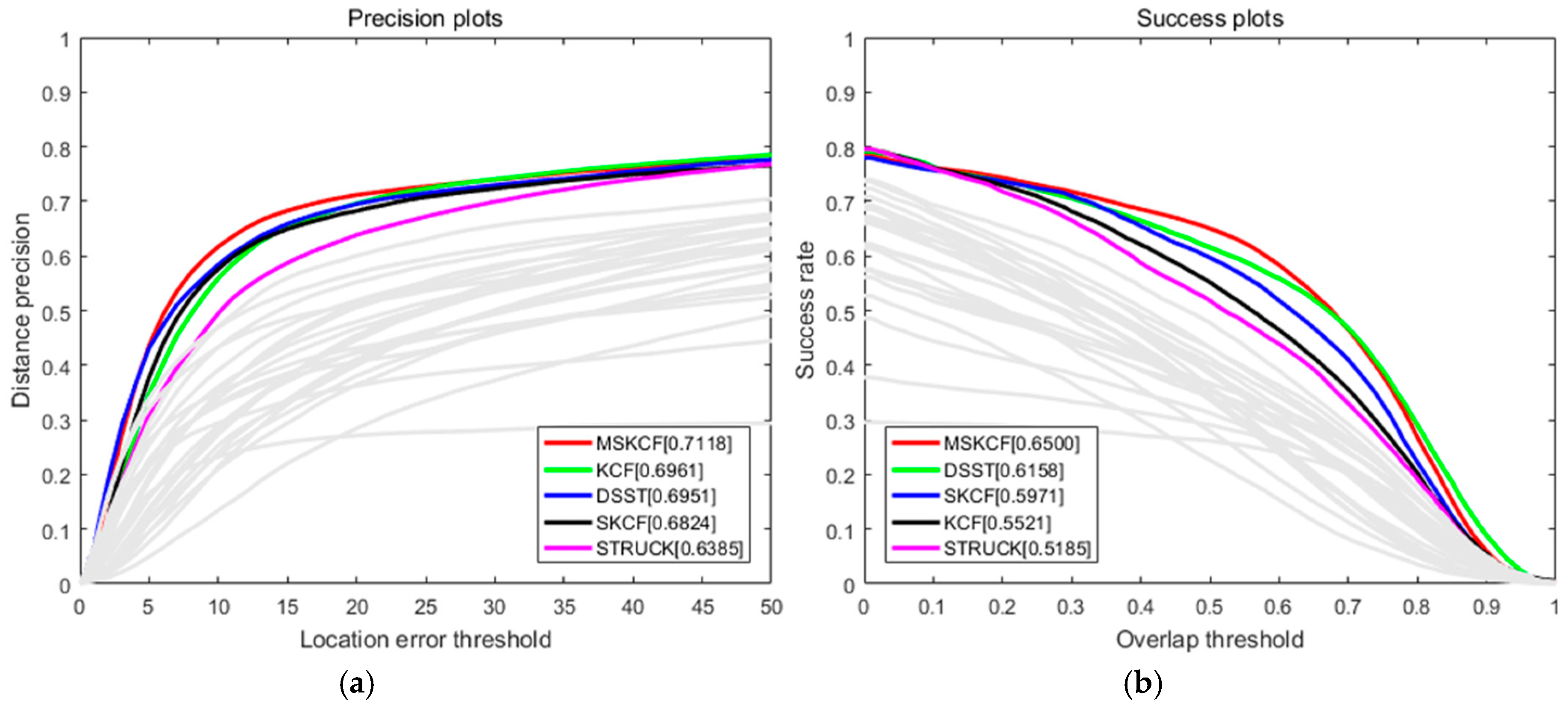 Precision (a) and success (b) plots over all 100 sequences using OPE for 29 trackers in [38]. The results of the top five ranks are indicated via the legend in the figure, and the other trackers are indicated using gray colored lines.
