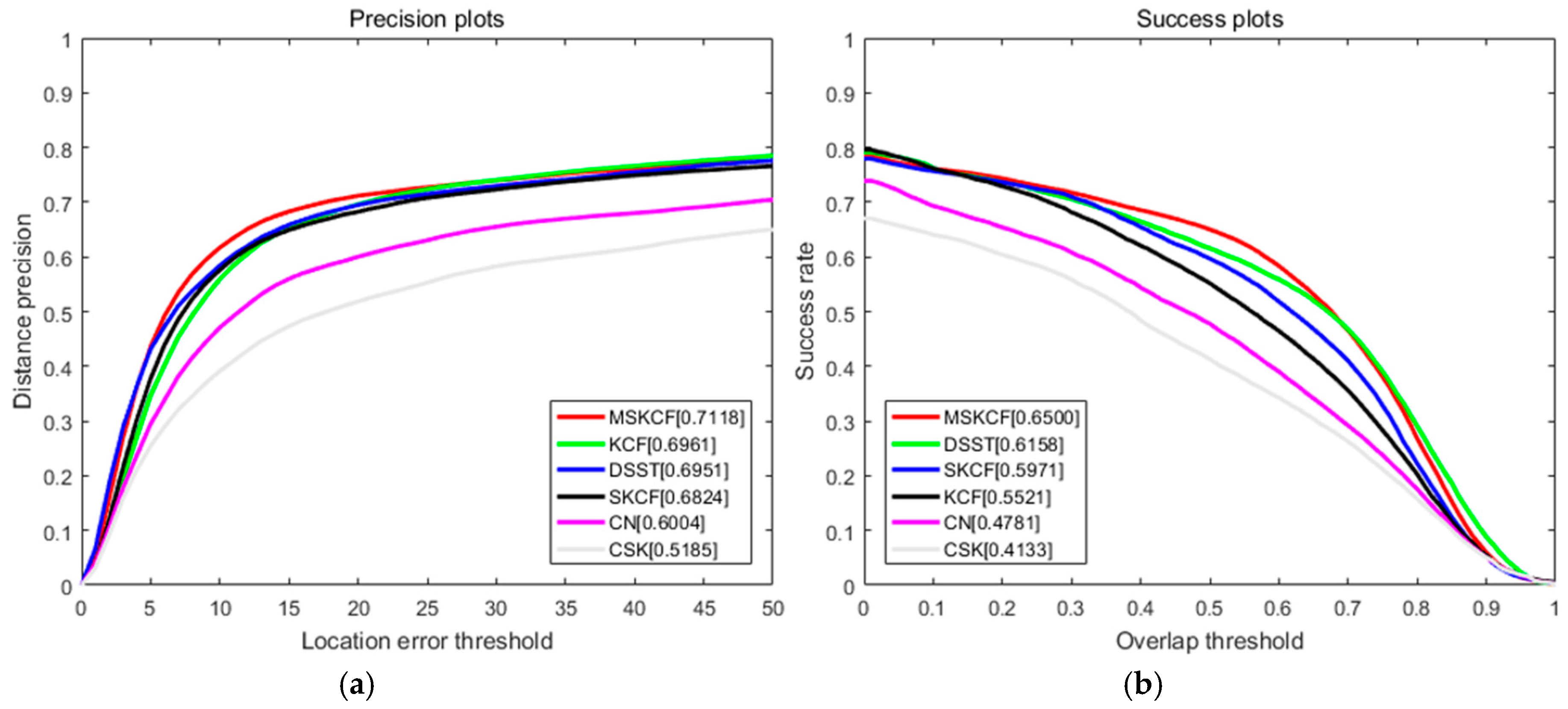 Precision (a) and success (b) plots over all 100 sequences using one pass evaluation for correlation filter-based trackers [14,15,17,18].