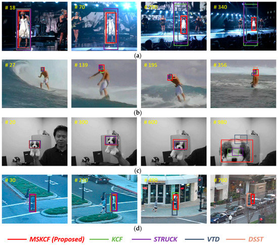 Tracking results under scale variations. (a) Singer1; (b) Surfer; (c) Dog1; and (d) Human4.