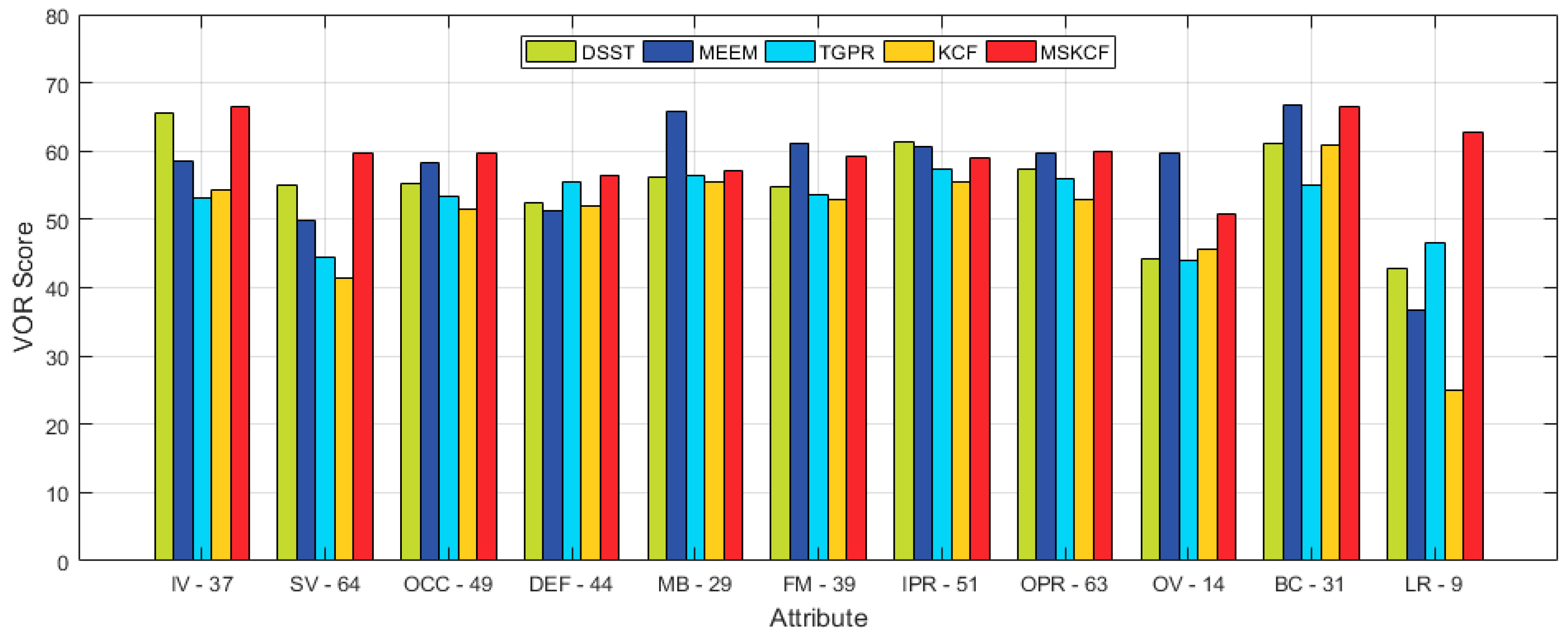 Average VOR ranking scores of the five most successful state-of-the-art trackers [15,16,31,32]. The OTB [38] 100 sequences are annotated with attributes such as illumination variation (IV), out-of-plane rotation (OPR), scale variation (SV), occlusion (OCC), deformation (DEF), motion blur (MB), fast motion (FM), in-plane rotation (IPR), out-of-view (OV), background clutter (BC), and low resolution (LR). The number next to each attribute indicates the number of sequences with this attribute.