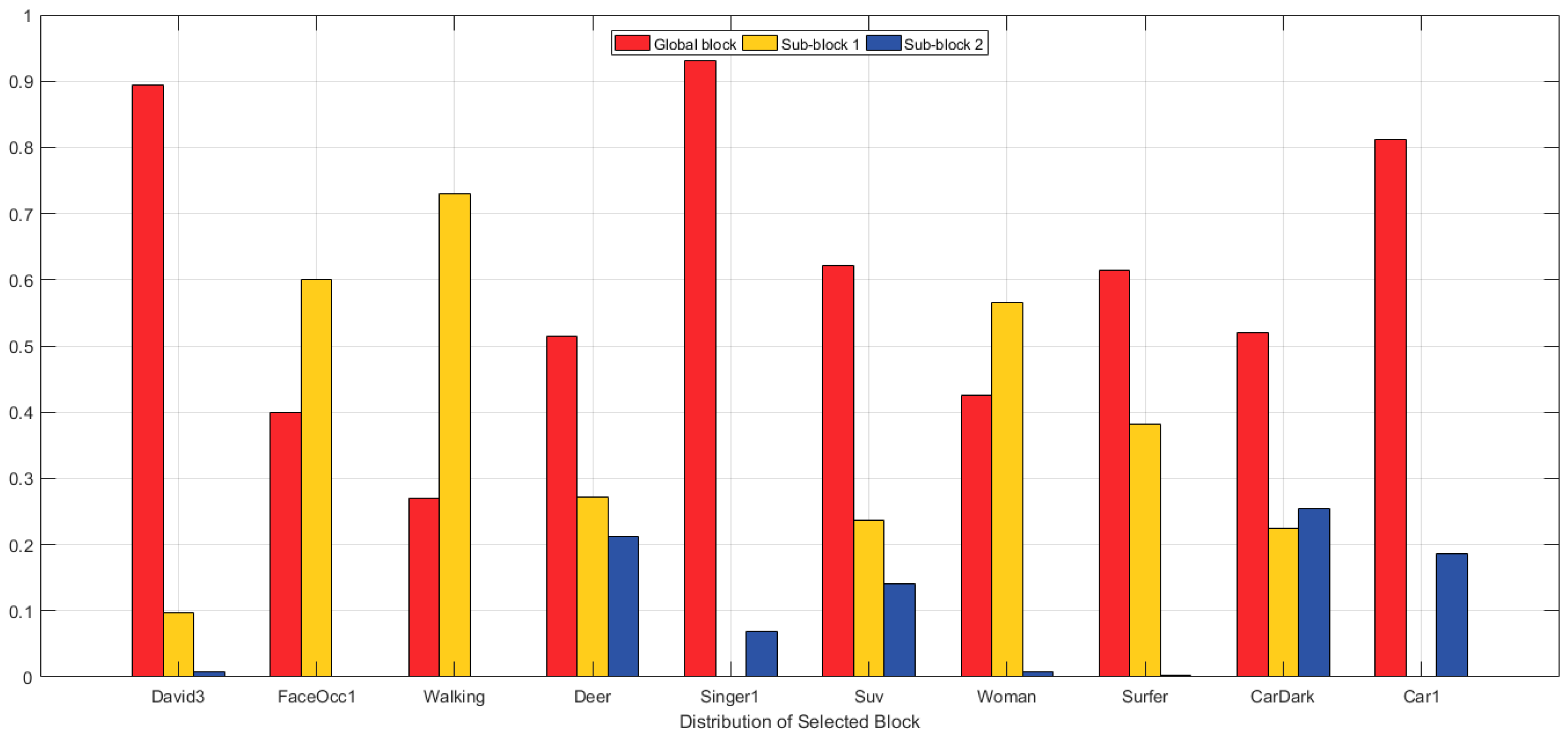 Figure 10 shows the probability of selection of each block or sub-block. In the David3 and Walking sequences, sub-block 2 has a very small likelihood of being selected, because in the sequence of images showing these people walking, the lower bodies continue moving, which implies there are several instances in which deformation occurs. On the other hand, if only the upper body experiences movement, sub-block 1 is not selected, as is the case with the Singer1 sequence. The SUV sequence has frequent occlusion from side to side. Therefore, all blocks are selected.