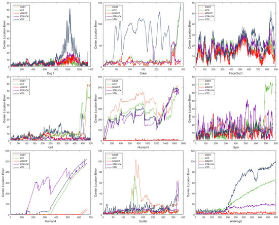 Center location error of each frame. The sequences contain challenging attributes such as scale variation, occlusion, and deformation.