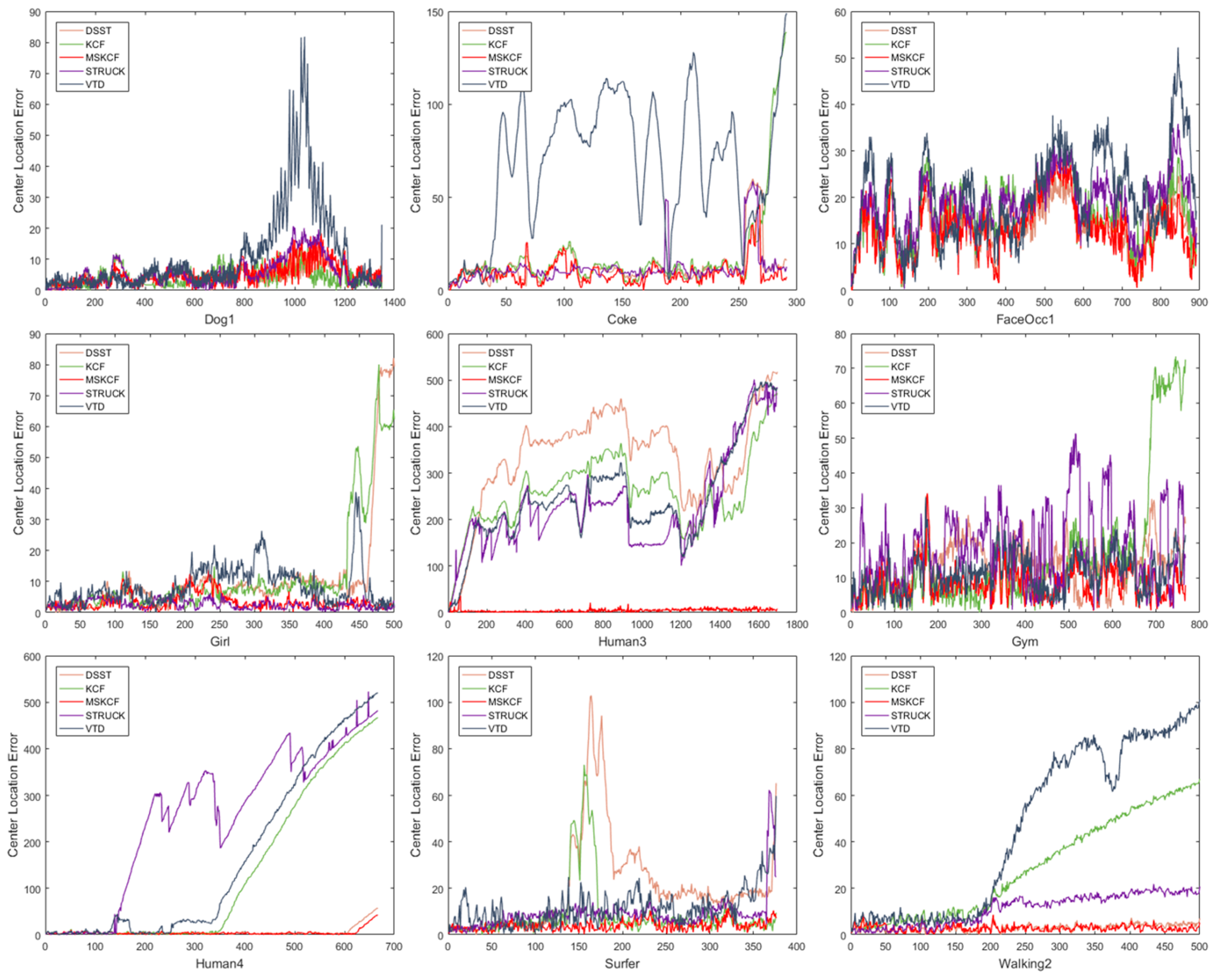 We conducted the experiment using center location error (CLE) to prove the performance of the proposed method. The Graph in Figure 11 shows that the proposed method has a low CLE in sequences containing the attributes of scale variation, occlusion, or deformation.