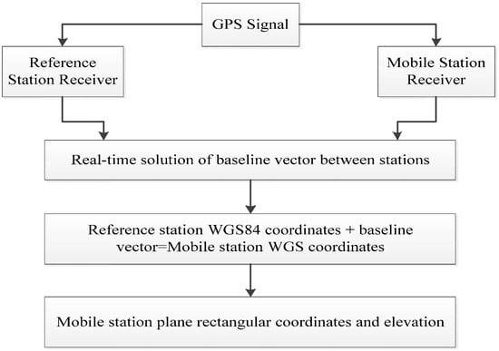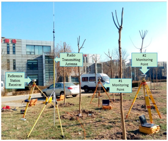 GNSS refers to all satellite navigation systems including American GPS; Russian Glonass; European Galileo; China’s Beidou navigation systems; and related enhancement systems. According to the characteristics of monitoring objects, GNSS deformation monitoring is divided into periodic measurement; fixed continuous GPS station array; and real-time dynamic monitoring. The first two types use static data calculation as the monitoring objects are generally viewed as static changes for slow deformation and long periods. In general, RTK monitoring is used to reduce the influences of different system errors and obtain real-time high-accuracy coordinates of measuring points. RTK monitoring is a real-time differential GPS technique based on the observed quantity of carrier phase, which is mainly applicable to long-term deformation with sudden changes and vibration deformation under ambient excitation. The working principle of the RTK technique is to set one GPS receiver at the reference station to observe all visible GPS satellites continuously and return real-time monitoring data to mobile stations. GPS receivers on mobile stations receive the observed data from the reference station through radio-receiving equipment while receiving GPS satellite signals. Subsequently, they perform real-time calculations and display 3D coordinates and accuracy of the user stations according to the principle of relative positioning [9]. The working mode is shown in Figure 1.