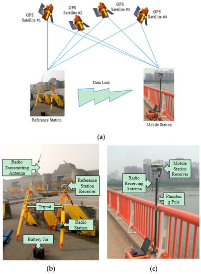GNSS-RTK system composition where (a) is the GNSS-RTK system; (b) is the reference station; and (c) is the mobile station.
