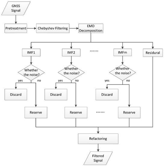 In general, the GNSS has a short baseline (<10 km) in structural dynamic monitoring, which can reduce errors caused by the troposphere and the ionized layer to some extent but cannot decrease multipath errors and random noise [26]. Therefore, the GNSS monitoring signals mainly cover real structural vibration information, multipath errors, and random noise. Multipath errors are mainly distributed in the 0–0.2 Hz frequency band [27], whereas random noise is distributed in a wide frequency band and has low energies. Given that the GNSS monitoring data contain countless noises and the vertical error is approximately 20 mm, the GNSS has difficulty in identifying millimeter-scale real vibrations of medium-sized and small bridge structures. An AFEC mixed filtering algorithm was proposed to solve these problems. Chebyshev filtering is applicable to ripple-like frequency response amplitudes on the pass-band or stop-band and is often used to filter structural vibration signals. The EMD technique decomposes signals from small to big according to the characteristic scale of local time, obtaining limited intrinsic modal functions (IMFs) from large to small frequencies. This technique has the advantages of multi-resolution and solution of the wavelet base selection in wavelet transform. Moreover, the EMD technique decomposes signals from scale characteristics of signals. It possesses good local adaptation and adaptability, and is convenient for filtering and de-noising non-stationary signals.