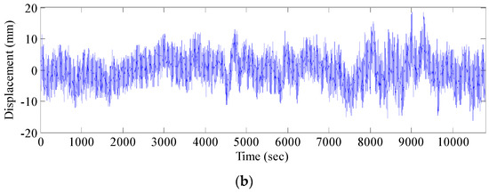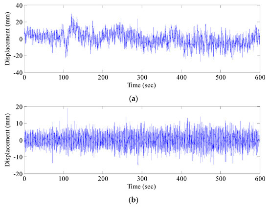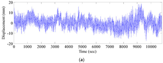 Dynamic responses of the Fumin Bridge under ambient excitations were monitored for 10 successive hours from 10:00 a.m. to 8:00 p.m. on 9 November 2016. The GNSS sensor collected the vibration displacement signal of the structure, while the accelerometer collected the vibration acceleration signal of the structure. Four groups of data were collected. The effective number of satellite signals that has been used in the measurements is 14–16, and it was constant throughout the test. The GNSS sensor and accelerometer recorded original data at the sampling frequencies of 20 Hz and 100 Hz, respectively. The calculated results of RTK were transmitted and stored in laptops through USB cables. The original data were preprocessed by deleting abnormal values according to the principle of triple standard deviation (99.7% confidence interval) and repairing missed data by cubic spline interpolation and data smoothing by the moving average method, thus obtaining the signal after preprocessing (Xi). The original vertical displacement sequence (x1) and signal after preprocessing (X1) at the #1 measuring point are shown in Figure 8.