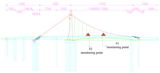 The Tianjin Fumin Bridge is in a central urban area. The main bridge is a self-anchored suspension bridge with a single tower and spatial cables. The tower is supported by one column. The main span cable is anchored at two sides of the girder, and the side span cable is anchored onto the ground, forming a stable structural system. The main span cable uses a 3D spatial line, which is a parabola on the vertical and horizontal surfaces. The side span cables use a group (two parallel lines) of cables without vertical sling (Figure 6). The total length of the bridge is 340.6 m, including 157.081 m main span and 86.4 m side span. The approach bridge at the east of the river is (19 + 20 + 19.6) m (three-span ordinary reinforced concrete continuous beams), and the approach bridge at the west of the river (single-span concrete framework with cantilevers) is 38.219 m.