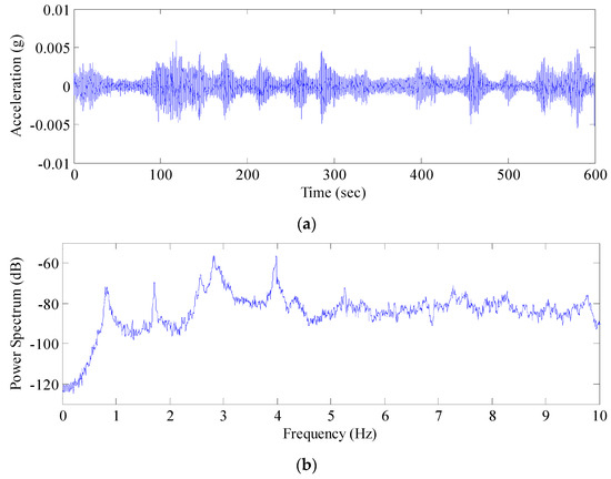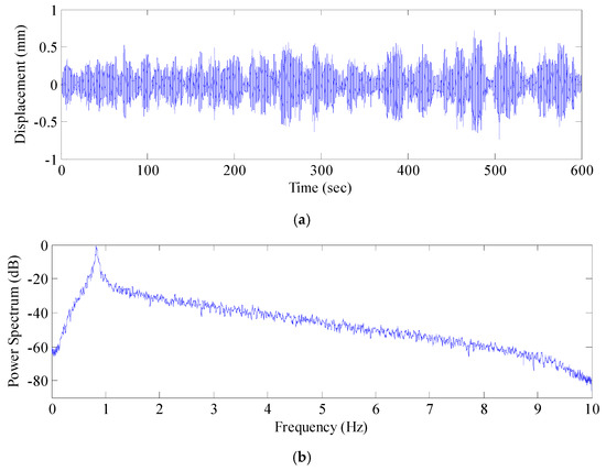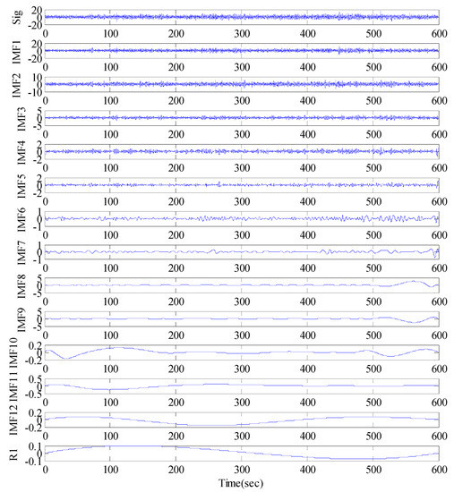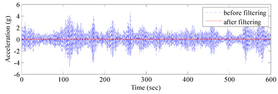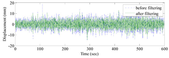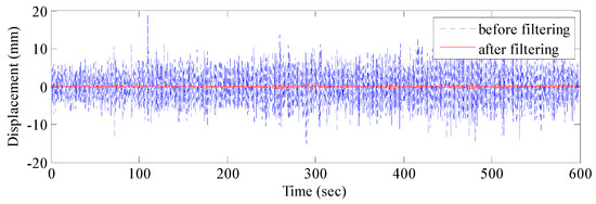 The EMD of the signal was conducted first (Figure 11), which provided 12 IMF components and one residual component. Subsequently, the normalized autocorrelation functions of 12 IMFs were solved (Figure 12). In Figure 12, the first seven IMFs conformed to the characteristics of random noise. The AFEC-filtered signal were reconstructed with the five remaining IMFs and R1. The real vibration amplitude of the bridge structure that was extracted by the AFEC de-noising was less than 1 mm, showing high accuracy. The comparison between the real vibration signals before and after AFEC de-noising is shown in Figure 13. Given that the vibration frequency of the bridge structure generally ranges between 0.1–10 Hz, only the 0–10 Hz frequency spectrum was analyzed by power spectral analysis. Acceleration signals within 0–10 Hz were collected using the Chebyshev band-pass filter method. Signals before and after filtering were compared (Figure 14).