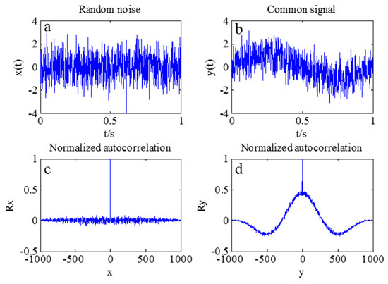 Normalized autocorrelation of the random noise and common signal. (a) Random noise; (b) Common signal; (d) Normalized autocorrelation and (d) Normalized autocorrelation.