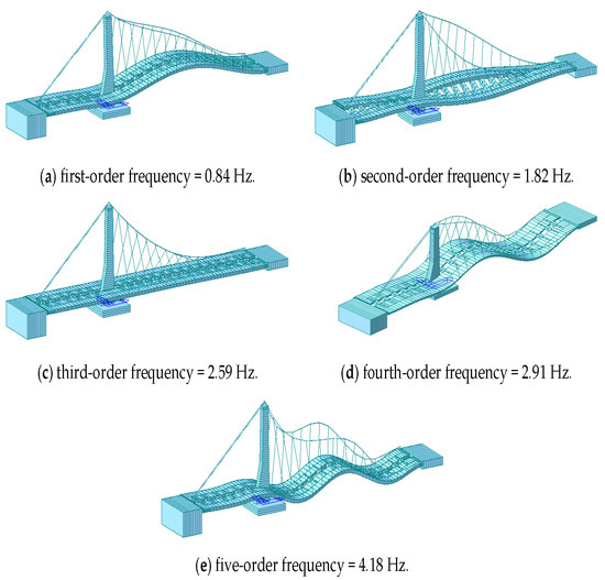 Next, the power spectra of the de-noised displacement sequence and the acceleration signal sequence were analyzed (Figure 15 and Figure 16). The AFEC-filtered GNSS-RTK displacement sequence identified the frequency of the bridge structure (0.82 Hz), and the filtered acceleration signal sequence identified the first five orders of frequency of the bridge structure, valued at 0.84 Hz, 1.82 Hz, 2.59 Hz, 2.91 Hz, and 4.18 Hz, respectively. The identification results were close to the finite element analysis results (Figure 17). The MIDAS Civil 2012 was used to establish the 3-dimensional finite element theoretic calculation model for the Tianjin Fumin Bridge to calculate the self-vibration modal parameters of the structure. In the calculation and analysis model, cable and suspender are simulated by cable element. Moreover, girder and tower are simulated by beam element. The model contains 625 nodes, 62 cable units and 882 beam elements.