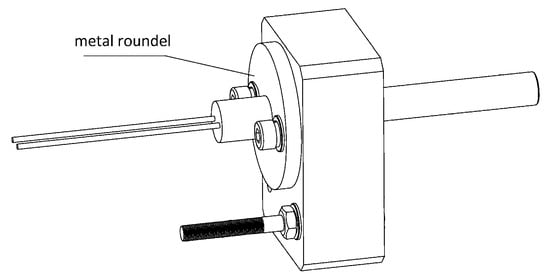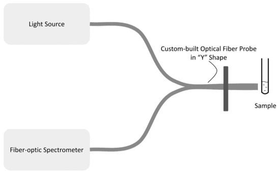 The optical fiber probe was custom-built in a “Y” shape, as shown in Figure 2, two branches divided near the light source, one directly pointing to the sample and the other connecting with the fiber optic spectrometer. A metal roundel with two thread holes was customized to be fixed to the branch of the optical fiber probe pointing to the tube, so the fiber probe could be fixed with the optical-fiber-probe-fixed block by two hex bolts, as depicted in Figure 3, and now the position of the optical fiber could be controlled by the mechanical unit.