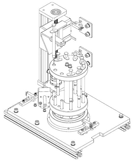 Figure 4 shows an appearance illustration of this unit in 3D, which was comprised of the following three parts in total: a rotatable detection stage module, an automatic sample injection module, and an optical fiber probe controller module. The detection stage module was placed in the bottom. The injectors and the tubes containing samples to be detected were put inside, and the rotatable sample-positioned stage herein could revolve around the center to switch each sample under detection one by one. The automatic sample injection module was used to press the samples in the injectors into the tubes right beneath them by the up and down movement of the injector compression plate. The optical fiber probe controller module was to control the station of the optical fiber probe as mentioned in Section 3.1.1.