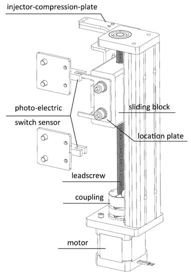 On the sliding block, two function plates were fixed with hex bolts. One was the injector compression plate right above the injectors. This plate could rise and fall in sync with the action of the sliding block to press the plunger of the injector down to push the sample out into the tube. The other one was the location plate of sliding block, functioning with two photo-electric switch sensors installed in the front surface of the back of the shell. This location plate is “U”-shaped, and two “hands” could trigger these two switches. In the up and down motion, the moment the upper photo-electric switch sensor was triggered by the upper “hand”, the motor would be stopped instantly by the microcontroller. This happened similarly when the lower photo-electric switch sensor was triggered by the lower “hand”. Thus, the rising and falling motion of this sliding stage could be restricted in this interval. In such an interval, the injector would be pressed just to the bottom, without overloading, which may damage the injector or be insufficient to leave residue.