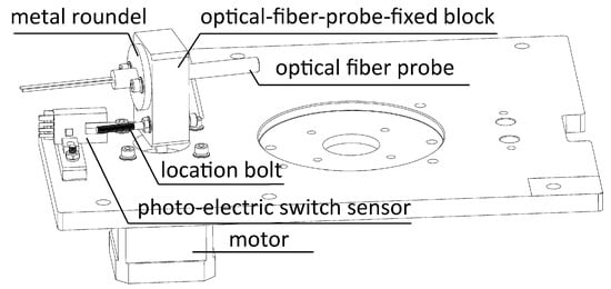 The optical fiber probe was fixed to the optical fiber probe fixed block by hex bolts through the screw holes on the metal roundel of this customized probe. The optical fiber probe fixed block was fixed on the shaft of the motor so that the optical fiber probe could be driven to revolve in sync with the motor. A location bolt was fixed on this block slightly below the probe used for orientation. During the spinning of this module it was able to trigger the photo-electric switch sensor installed nearby and, at that time, this module would be stopped. In that case, the optical fiber probe would precisely point at the tube under detection.