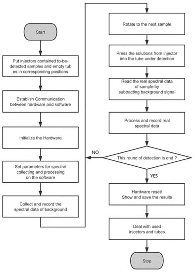 A typical flow chart of this software is illustrated in Figure 8. To start a detection, the operator would put in several single-use injectors that have already imbibed moderate samples and the same number of empty tubes, then set appropriate parameters and initialize the whole instrument system. After that, the system would work to obtain the spectral signals and then manage the result from them. At the end, when all of the samples in this run had been detected, the system would revert to its initial status. Detection results would be shown in the panel and saved on the computer automatically.