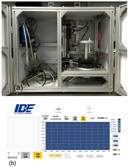 Figure 9a presents the overall arrangement of all the components inside. The light source and the fiber optic spectrometer were fixed on the left wall of the instrument, connected together by the optical fiber probe. The whole mechanical unit was placed in the right side of the instrument. The power supply cables and USB communication lines went out from the instrument through a small hole on the bottom-rear of the unit. The hardware was covered by an aluminum extrusion-made shell, blocking out light from the environment. Figure 9b shows the main user interface of the LabVIEW-based software and this software had been installed in the notebook computer in advance.