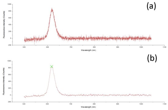 A comparison of the spectrum curve before and after processing are presented, respectively, in Figure 10a,b, revealing a readable curve and the peak with a cross mark.