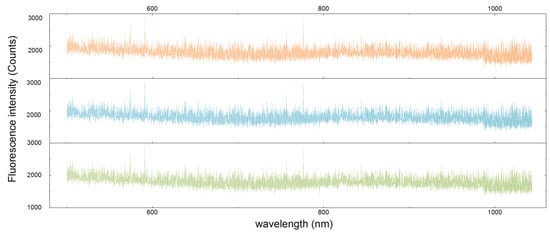 Ten empty tubes and ten injectors with 0.1 mL of PBS were placed into the rotation stage, and the parameters related to data processing were settled as described in Section 4.2. To eliminate the interference of the light source whose center wavelength is near 460 nm, the range of the spectrum curve was limited to between 500 nm to 1040 nm. Three spectra curves selected randomly from the test are presented in Figure 11. The tendency and amplitude of them seemed to be quite approximate.