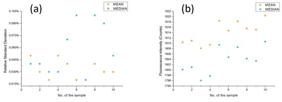 For a quantitative comparison, means and medians of all of these lists of spectra data were calculated. As for each sample, measurements were repeated six times. The comparison of relative standard deviation (RSD) of these means and medians for each curve is represented in Figure 12a. Afterwards, the comparison in the form of fluorescence intensity of the means and the medians between these ten samples in ten different detection stations was also done and the result is shown in Figure 12b.