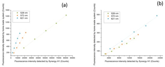Figure 13a,b show the correlation of the detection results in terms of the intensity of optic signal between this home-made instrument system and the Synergy™ H1. The correlation coefficient (R value) was 0.99974, 0.99973, and 0.99847 for each type of single QD solutions, and the results for the mixed samples were 0.99596, 0.99939, and 0.99723 in three wavelengths, respectively, all of which were at a high level, suggesting a similar performance between these two instruments at these three wavelengths, though in different orders of magnitude in the recording of fluorescent intensity.