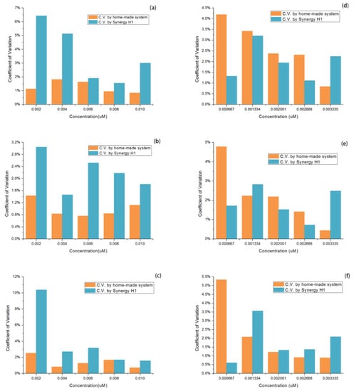 More linear calibrations were obtained, as shown in Table 1 and Table 2. The contrast about the reproducibility for the same concentrations between the four repeats based on the value of coefficient of variation for all are shown in Figure 14a–f.
