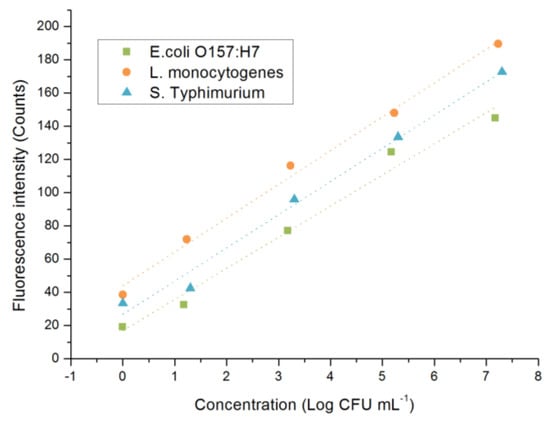 As introduced in Section 2.2, three typical kinds of food-borne bacteria, E. coli O157:H7, L. monocytogenes, and S. Typhimurium, were chosen to prove that this instrument system is able to detect bacteria. The test samples containing three kinds of bacteria together had been prepared from 100–107 CFU·mL−1. Three repeats for each sample were done and the linear relationships between the cell population (converted to log values) and the fluorescence intensity for each pathogen are presented in Figure 15.