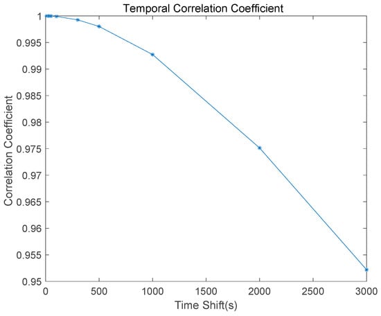 Once the ambiguity of the carrier phase has been determined during the cycle-slip free session, the ionospheric error can be obtained. We analyzed the temporal correlation of the calculated 24-h ionospheric error for all the satellites to various time shifts, 10, 30, 50, 100, 300, 500, 1000, and 2000 s. As shown in