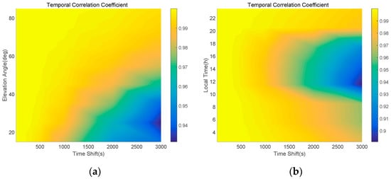 Figure 5 shows that the temporal correlation of high-elevation satellites during the night is strong. The coefficient for the elevation angle at 15° with a time constant of 100 s is 0.9998, which is the same as the value of the elevation angle at 85° with a time constant of 1000 s. The temporal correlation coefficient with 100 s time shift is also 0.9998 at 2 p.m., which can be obtained when the time constant is increased to 300 s at 10 p.m.