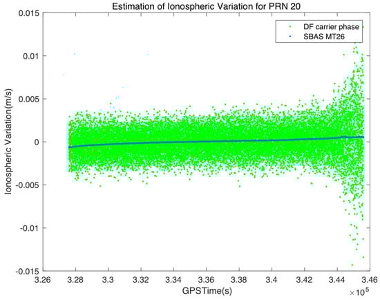 Figure 7) than that of the ionospheric delay, the errors accumulated for the smoothing time by the Klobuchar model is larger than those by the SBAS MT 26. According to Equation (35), the time constant calculated by our suggested algorithm is up to 1000 s or more, thus the residual errors of the suggested SF divergence-free Hatch filter need to be compared to those of other methods after being accumulated for the last 1000 epochs. The RMS of the accumulated ionospheric residual errors, the 0.26 m, which is far larger than 0.10 m of the SBAS MT 26 and 0.06 m of the IONEX. Therefore, the estimation of the ionospheric variation by the SBAS MT 26 is a practical and accurate solution for the divergence compensation of the SF Hatch filter.