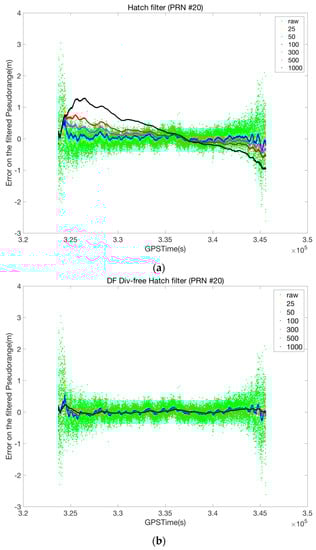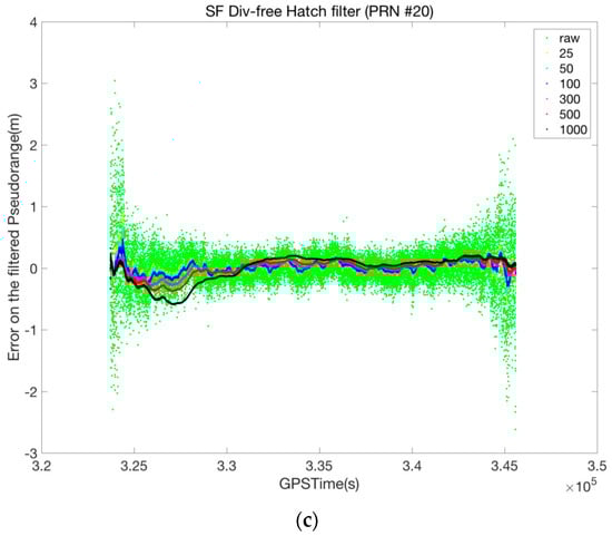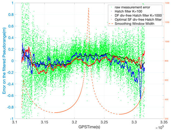 To compare the general characteristics of the conventional Hatch filter, DF divergence-free Hatch filter, and the suggested SF divergence-free Hatch filter, we applied three kinds of filters to the P057 data for various smoothing window widths of 25, 50, 100, 300, 500, and 1000, and then analyzed the performance of each filter in a range domain. To evaluate the filter performance, we calculated the residual error by the difference between the filtered pseudo-range and the true observable, which had been obtained by post-processing the carrier phase.