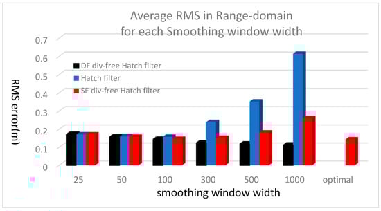 Table 2 also compares the performance of the optimal SF divergence-free Hatch filter with those of the filters with a fixed smoothing window. As described above, the smoothing window width can be as large as 1000 or more depending on the elevation angle, but its RMS error in the range domain remains at the smallest level among all fixed-width trials.