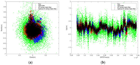 Figure 15 in order to analyze the spatial effect of the site on the position accuracy and to verify the generic applicability of the suggested algorithm. We collected the code and carrier measurements of each site from 13:00 to 15:00 local time, which includes the time of the strongest ionospheric activity, 14:00. The Hatch filter with a fixed time constant of 100 s and the optimal SF divergence-free Hatch filter were applied to the 2-h data.