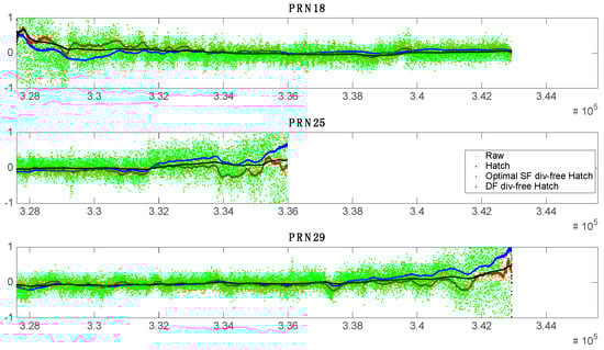 Figure 13. All the filters can smooth the measurements for the highly-elevated satellites sufficiently, thus, their residual errors are almost zero for the high elevation angle cases having negligible temporal ionospheric delay gradients. Each filter, however, shows different tendency to each other for the measurements from low elevation satellites, often having large temporal ionospheric delay gradients. The DF divergence-free Hatch filter does not allow a large residual error even when the PRN 25 and 29 satellite is almost setting down. Although the low elevation satellite errors become fluctuated after smoothed by the SF divergence-free Hatch filter, the errors are still near to zero and placed on the overall tendency of that of DF divergence-free Hatch filter. On the other hand, the residual errors of the conventional Hatch filter grow up slowly as the elevation of the satellite decreases. Its errors for the new satellite (PRN 18) also gradually increases after the filter initialization, while the errors of other filters stay near to zero, with only a slight fluctuation after a convergence.