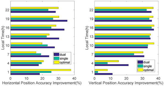 We also analyzed the effect on the position domain due to the variation in the temporal correlation of the ionospheric error throughout the day. For analysis, the accuracy improvement, by applying each filter to the raw GNSS code measurement in local time, was calculated. As shown in