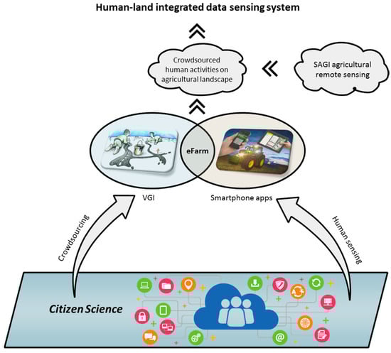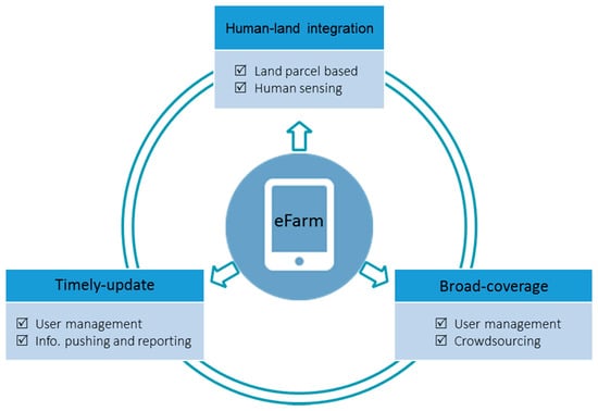 Currently, observations of an agricultural land system (ALS) largely depend on remotely-sensed images, focusing on its biophysical features. While social surveys capture the socioeconomic features, the information was inadequately integrated with the biophysical features of an ALS and the applications are limited due to the issues of cost and efficiency to carry out such detailed and comparable social surveys at a large spatial coverage. In this paper, we introduce a smartphone-based app, called eFarm: a crowdsourcing and human sensing tool to collect the geotagged ALS information at the land parcel level, based on the high resolution remotely-sensed images. We illustrate its main functionalities, including map visualization, data management, and data sensing. Results of the trial test suggest the system works well. We believe the tool is able to acquire the human–land integrated information which is broadly-covered and timely-updated, thus presenting great potential for improving sensing, mapping, and modeling of ALS studies.