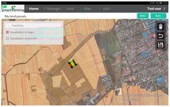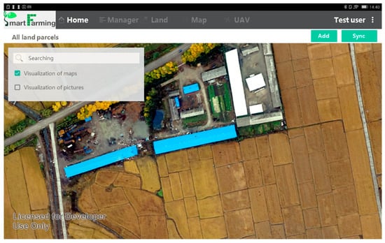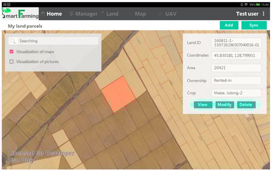 In order to observe the human-land integrated information on agricultural landscape, it is necessary to present high resolution, clearly visible, and georeferenced images as basemaps which are able to be referred and edited on the app. The Application Programming Interface (API) enables external maps and images—from a third party such as Google Map (https://maps.google.com/), Baidu Map (http://map.baidu.com/), and Tianditu (http://www.tianditu.com/)—to be visualized in the system for a particular region as the basemap (Figure 3). In addition, the basemap could be the timely acquired UAV (unmanned aerial vehicle) images from the SAGI agricultural remote sensing system when other images are insufficient (Figure 3). The candidate basemaps are prepared in the data center (e.g., selection and geometric calibration) before they are visualized in the smartphone app, and the maps with unclear boundaries of land parcels are excluded at this prescreening stage. The well-prepared maps in the data center can be freely switched, displayed and zoomed-in/out when they are ready to be viewed in the app with internet. Visualized maps will be automatically downloaded locally, so that the internet is no longer required for further visualization. The specific meta information (e.g., the exact data acquiring time, and the spatial extent) is accessible associated with the visualized map, and the default visualized map is given to the latest captured one.