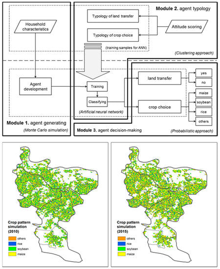 Moreover, the detailed and geotagged land use information sensed from individual farmers would facilitate advanced ALS studies, such as agent-based land system modeling [], by linking together the different research perspectives (micro and macro respectively) and the different aspects of datasets (human-sensing and remote sensing, respectively) (Table 1). At such an initial development stage, a well conceptualized agent-based land system change model called CroPaDy [] has been linked with the database of eFarm, which enables a direct modeling work given the required data such as household characteristics and land use decisions are available (Figure 7).