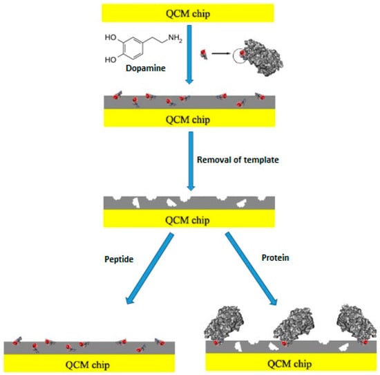 It is also possible to detect target proteins in biological samples by using MIP-based QCM sensors. If the template is a large biomolecule such as an enzyme or protein, the surface imprinting strategy is used. In another remarkable study, a MIP-based QCM sensor selective to ribonuclease A was developed by Liu and his research group [35].