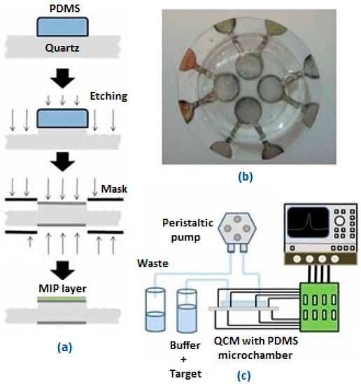 (a) Schematic demonstration of MIP-based QCM sensor; (b) Prepared MIP based-QCM sensor with multi-channel; (c) Schematic depiction of the prepared sensor system combined with impedance analyzer (reproduced with permission from [28]).